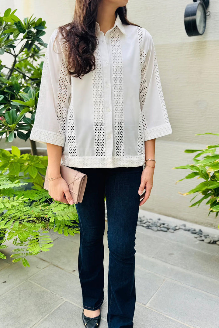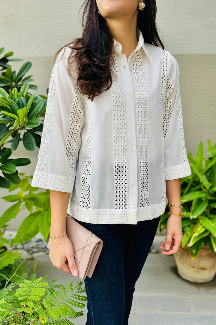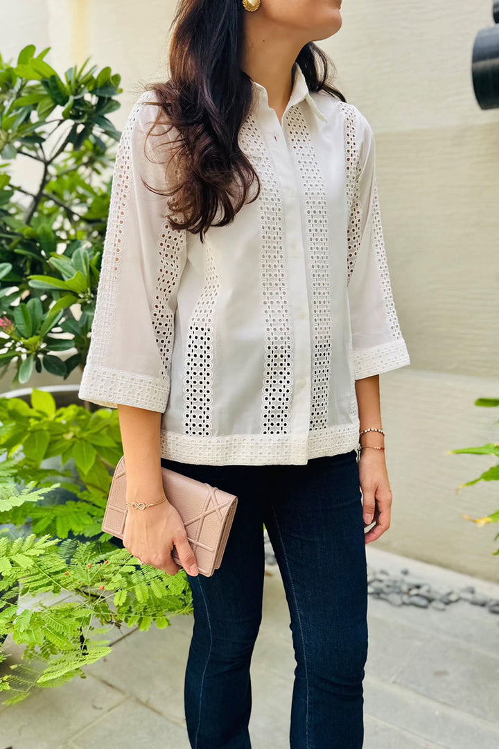 Offwhite cutwork shirt with intricate eyelet detailing and a relaxed fit, classic collar and button down design.