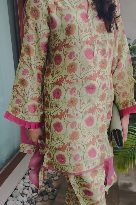 This elegant Korean raw silk top features pure organza piping along the neckline and daman, with delicate organza pleats on the sleeves for a refined touch. Handcrafted beaded buttons enhance its sophisticated appeal. The matching Korean raw silk shalwar is accented with coordinating organza piping, while the 2.75-yard pure chiffon dupatta, finished with a Korean raw silk border, completes the ensemble, making it perfect for festive or special occasions.
