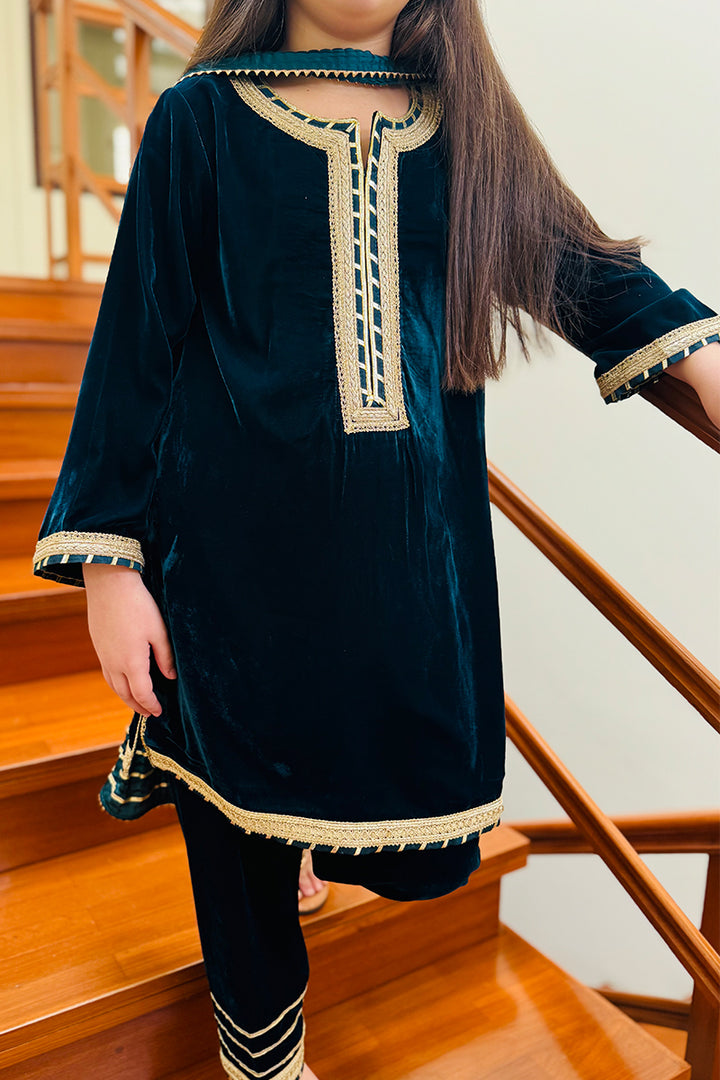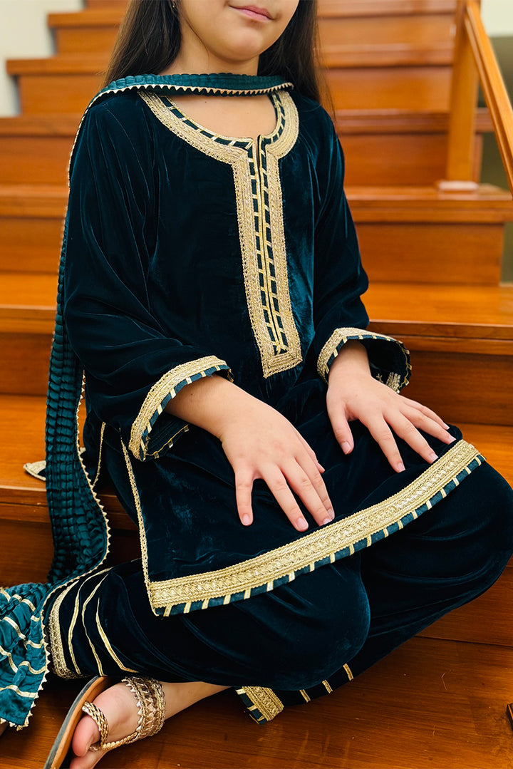A soft velvet outfit for kids, adorned with gota and paired with a crushed dupatta.