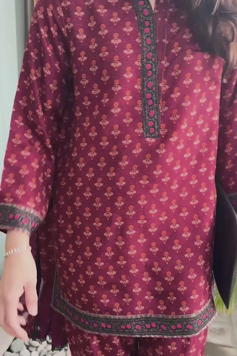 This elegant Korean raw silk top features matching Korean raw silk borders on the neckline, daman, chaaks, and sleeves, giving it a structured and sophisticated finish. The coordinating Korean raw silk shalwar complements the top beautifully. Completing the ensemble is a 2.75-yard pure chiffon dupatta, finished with Korean raw silk borders and delicate lace on all four sides, creating a graceful outfit perfect for festive or special occasions.