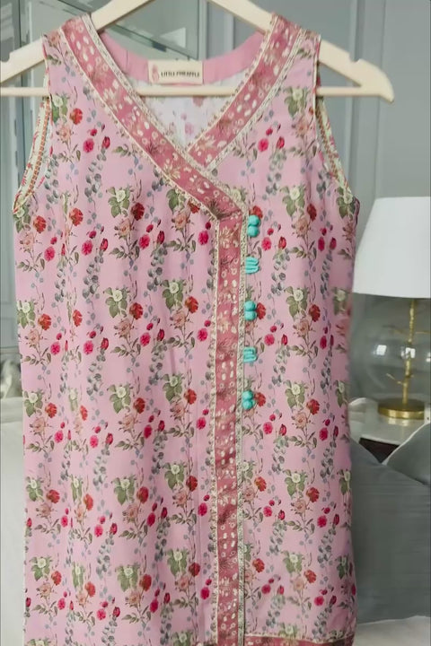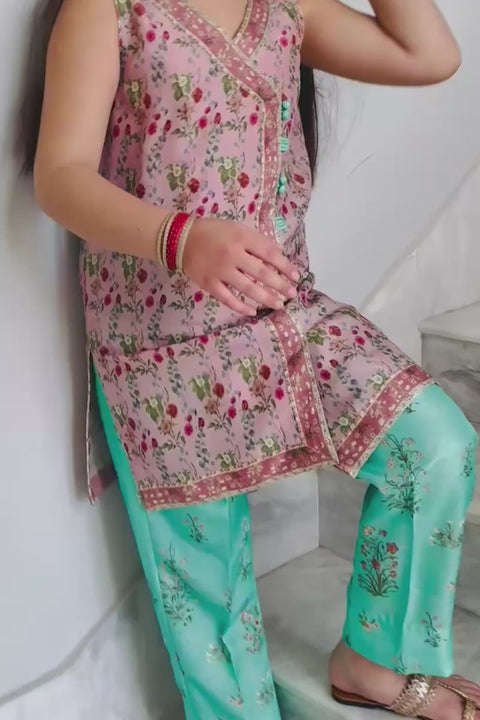 A charming kids ensemble crafted in a premium Korean raw silk, featuring a sleeveless printed angrakha with delicate finishing. Paired with a contrasting pants.