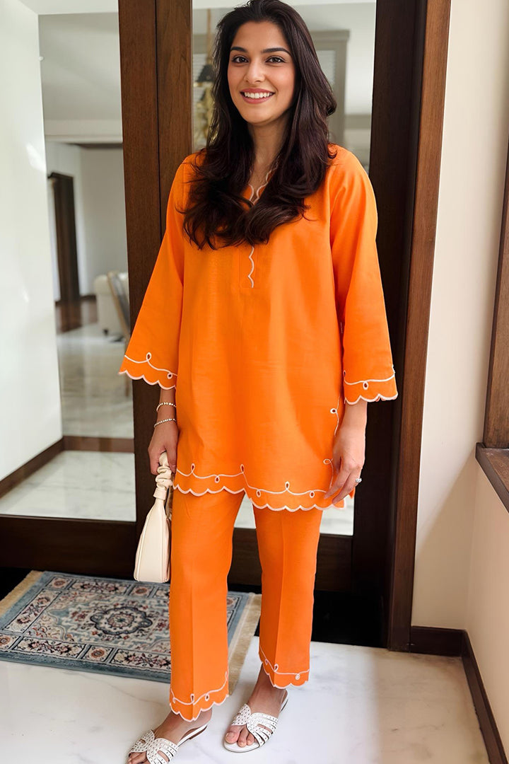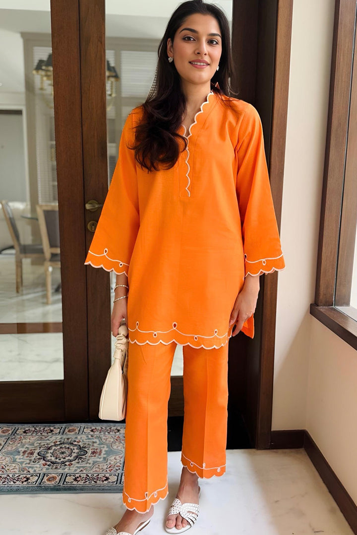 A warm orange fall-toned kurta and pant set, beautifully finished with off-white cutwork and scalloped detailing for a soft, elegant contrast.