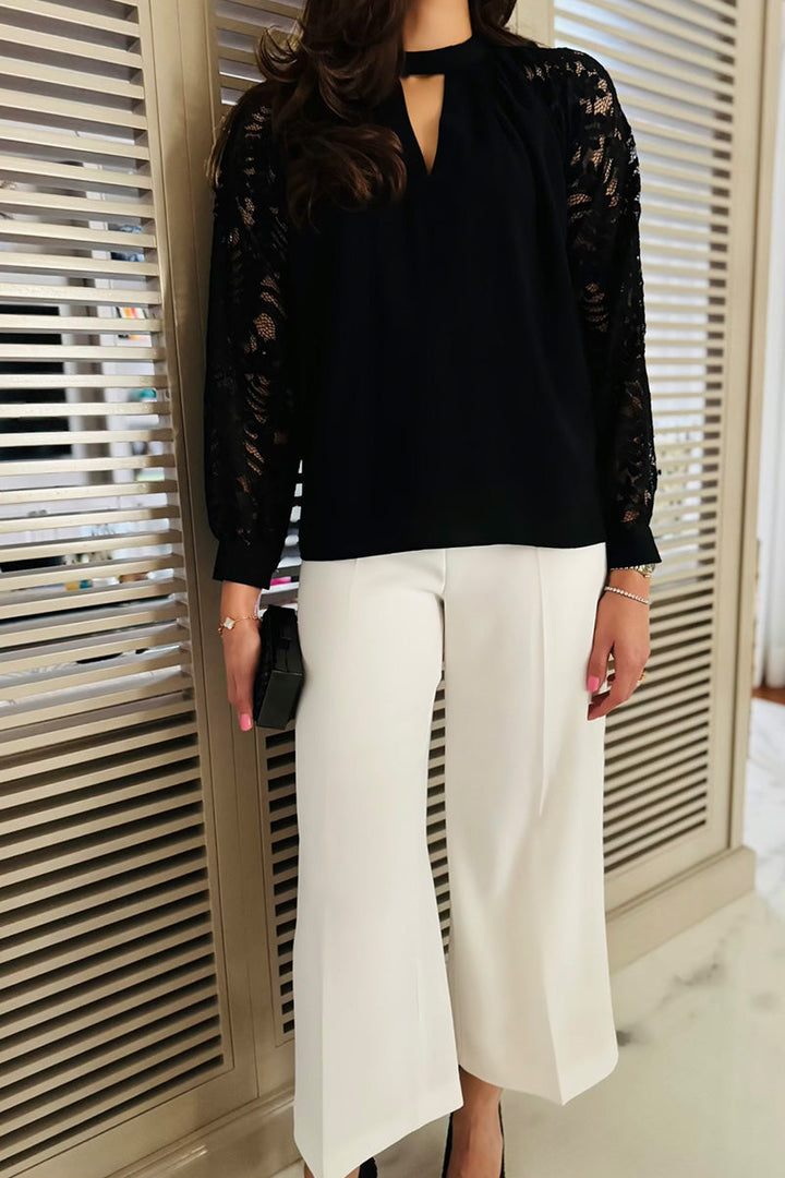 This chic top features delicate Chantilly lace sleeves & cuffs adding a timeless touch to the design.