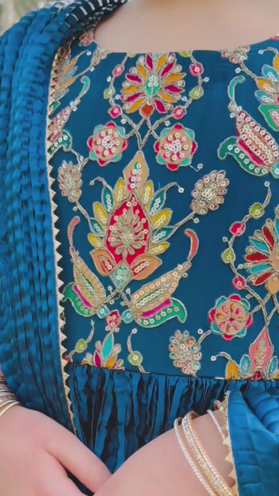 A timeless Anarkali silhouette featuring a beautifully crafted yoke adorned with intricate zari handwork, adding a touch of traditional elegance. The flowy crushed silk lower is finished with delicate gotta ribbons along the daman, creating graceful movement with every step. Paired with a matching silk pant and completed with a crushed dupatta finished with refined borders, this ensemble is perfect for Eid and special festive occasions.
